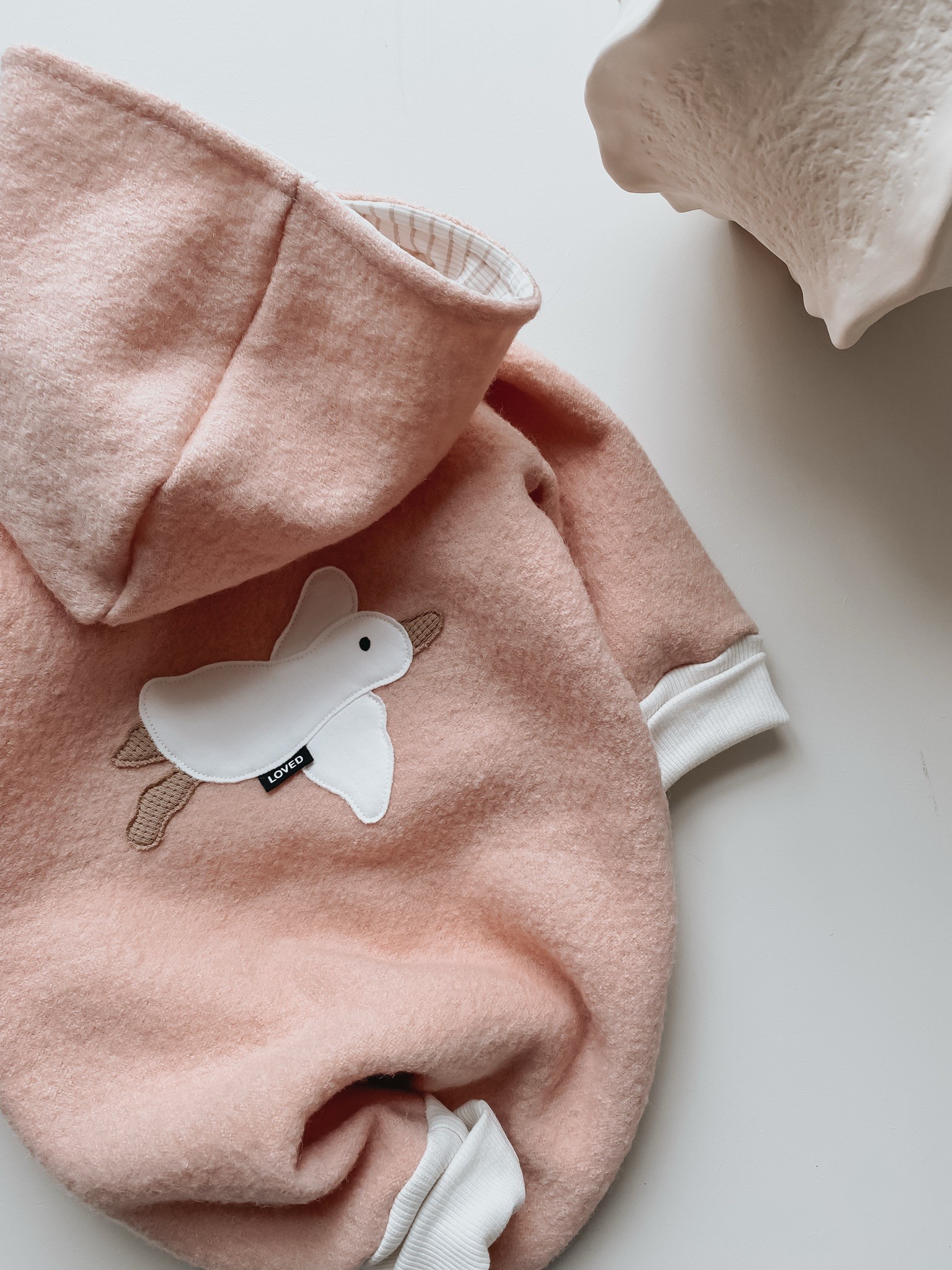 Handgemachter Wollwalk Overall „Rose Goose“ – Gefütterter Baby Walkanzug aus 100 % Schurwolle (mulesingfrei)