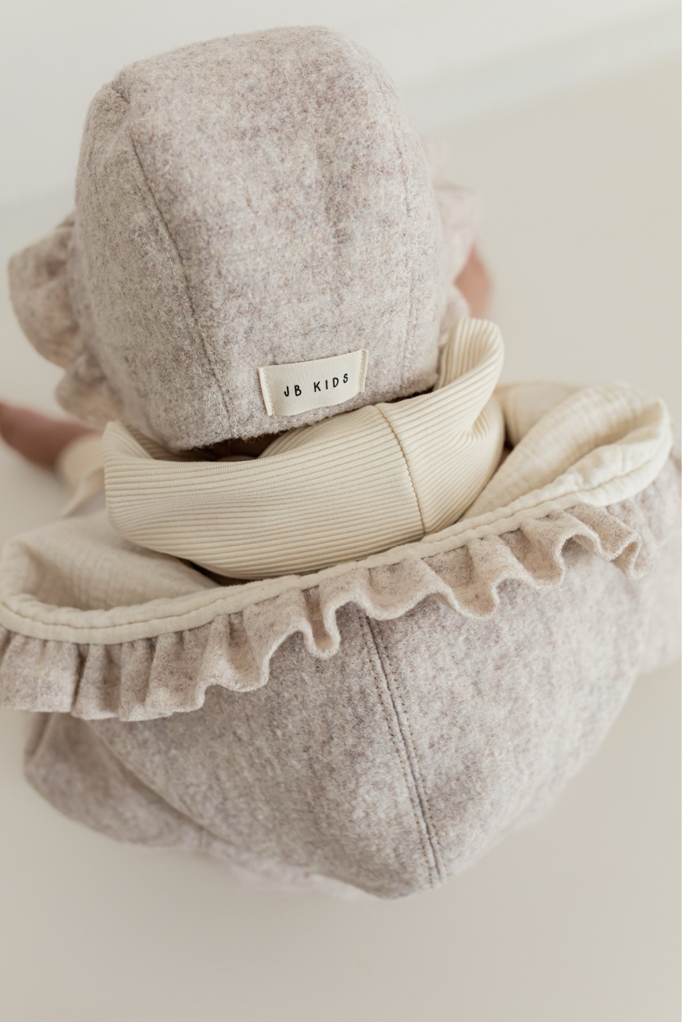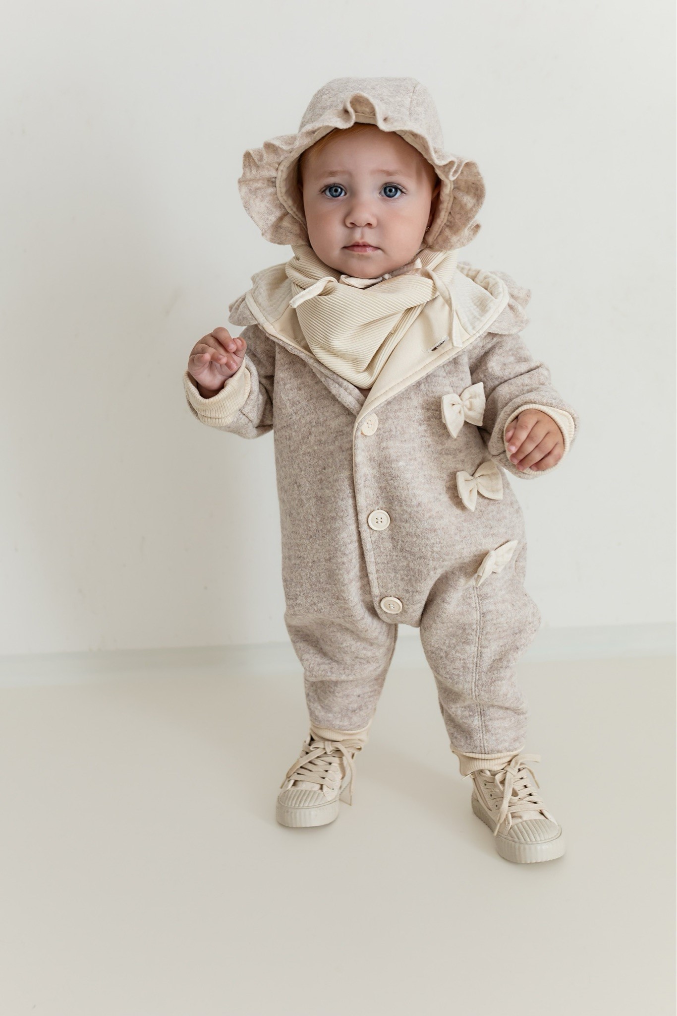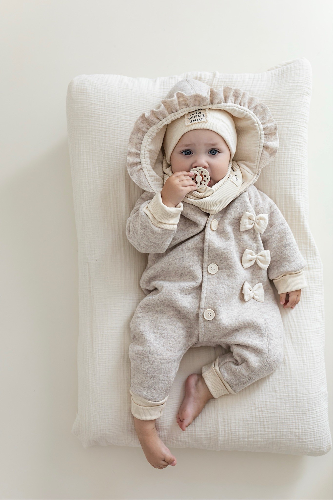 Unser Premium Walkanzug vereint natürliche Wärme, Bewegungsfreiheit und zeitloses Design. Mit Details wie feinen Zierschleifen und einer Kapuze mit Rüschen wird er zum Hingucker für kleine Entdeckerinnen und Entdecker