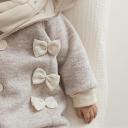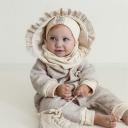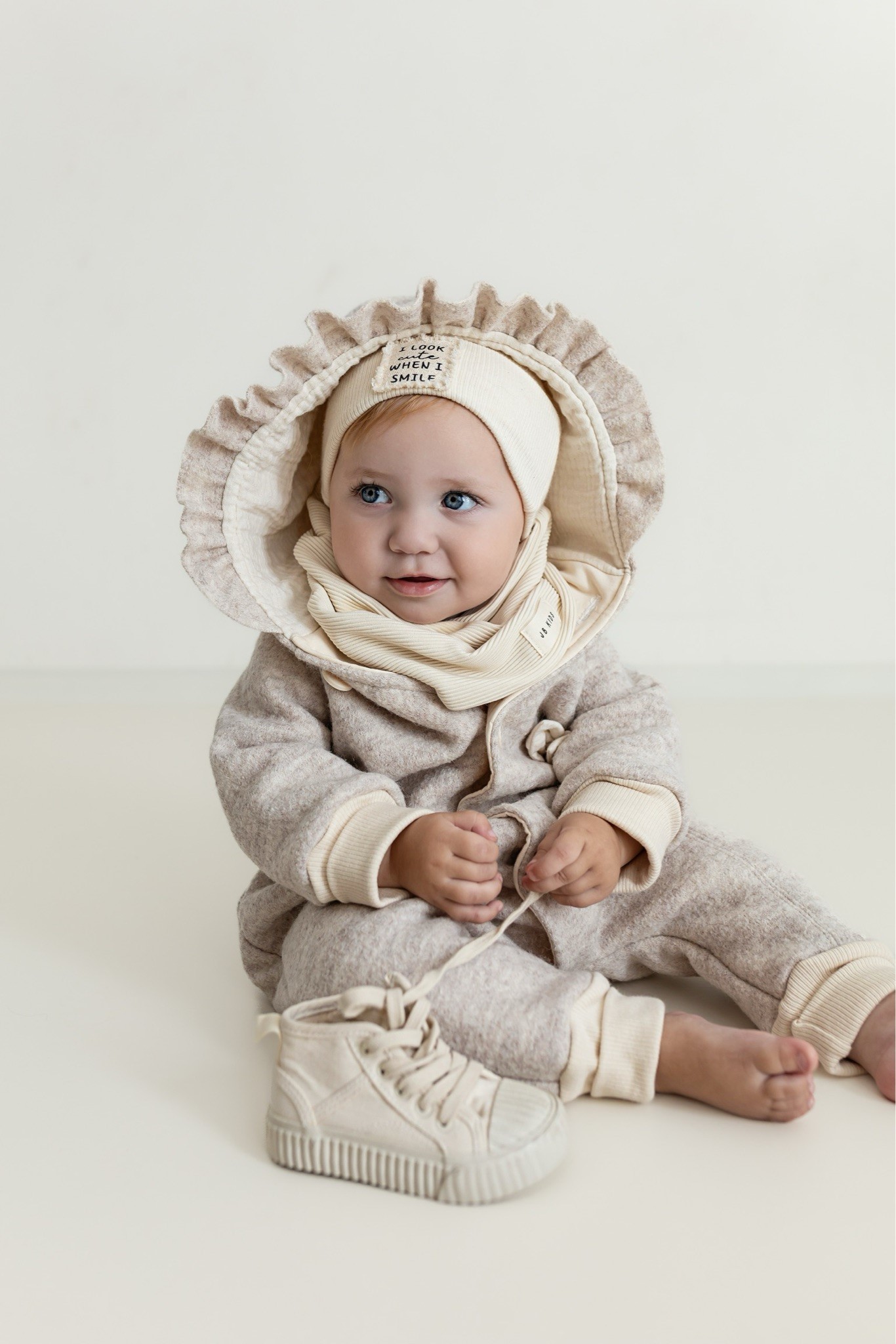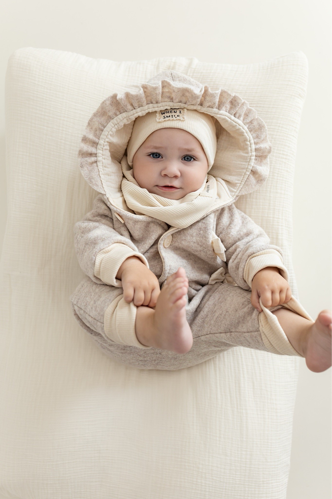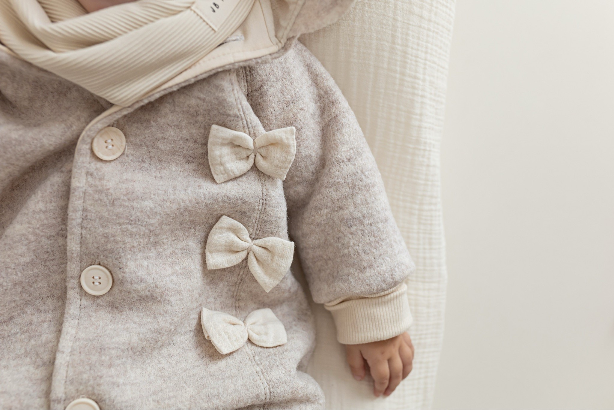 Unser Premium Walkanzug vereint natürliche Wärme, Bewegungsfreiheit und zeitloses Design. Mit Details wie feinen Zierschleifen und einer Kapuze mit Rüschen wird er zum Hingucker für kleine Entdeckerinnen und Entdecker