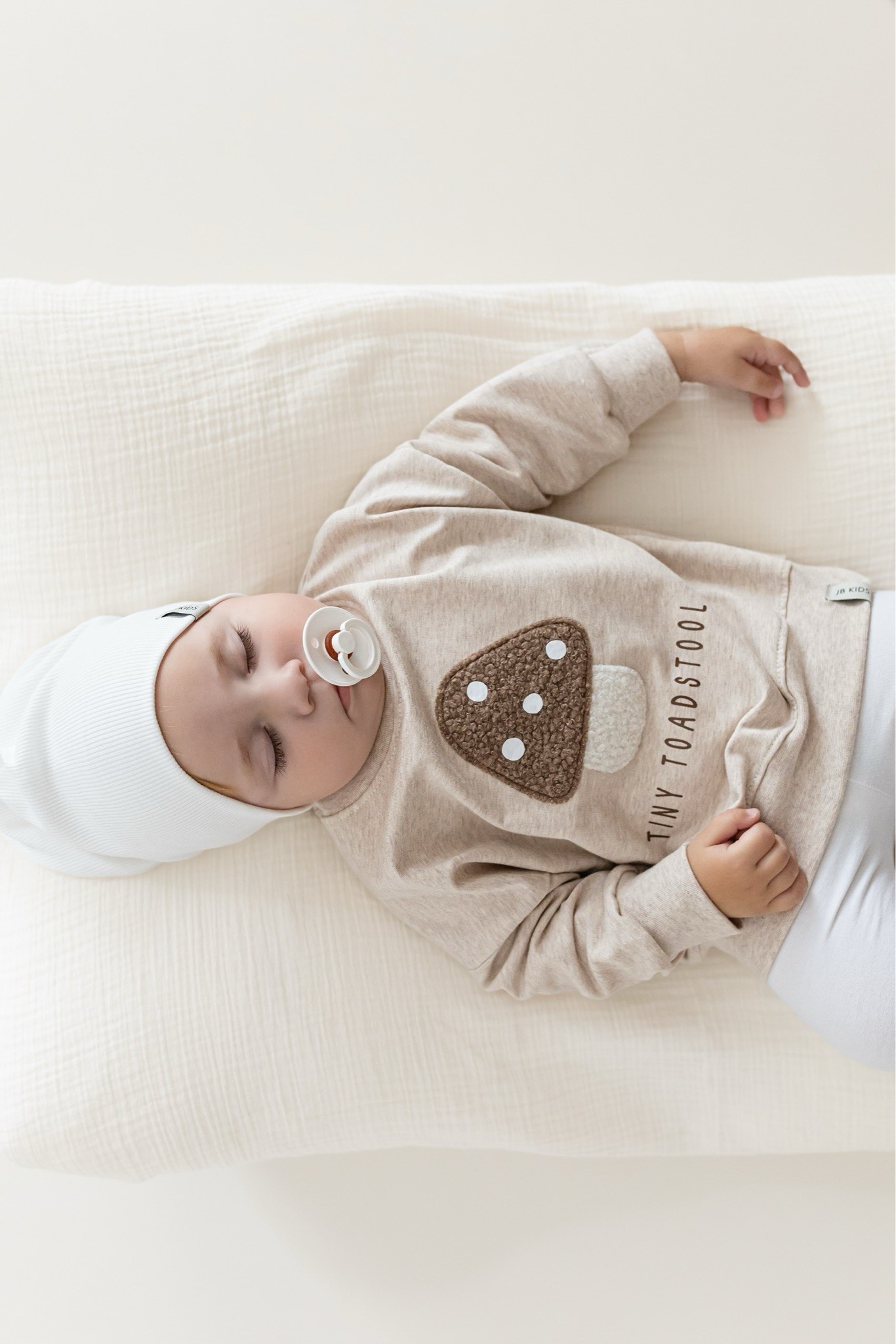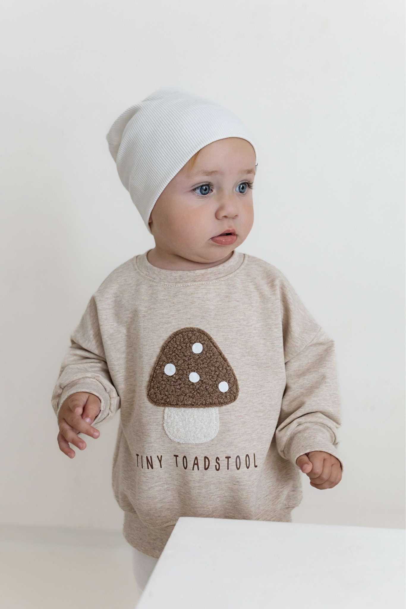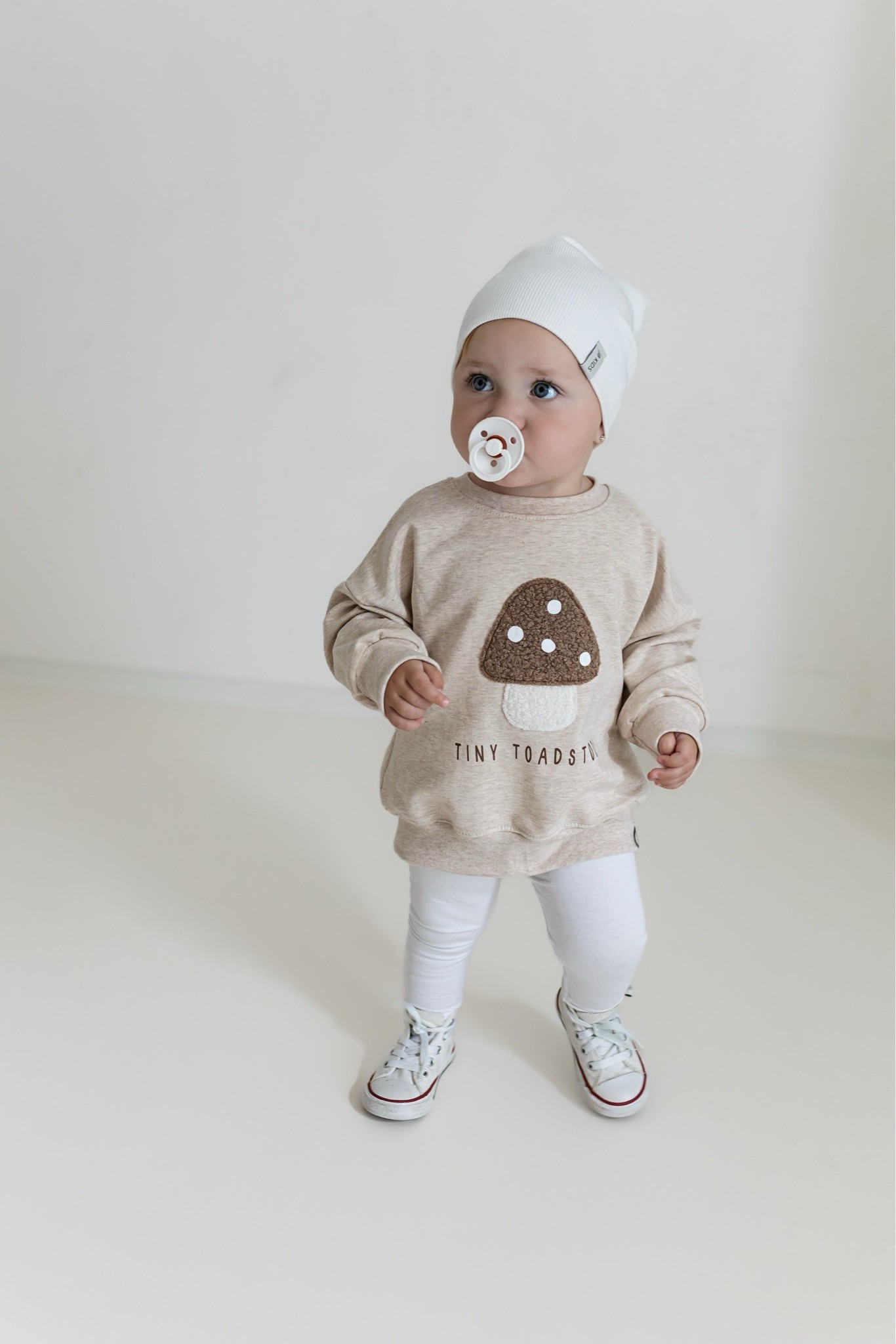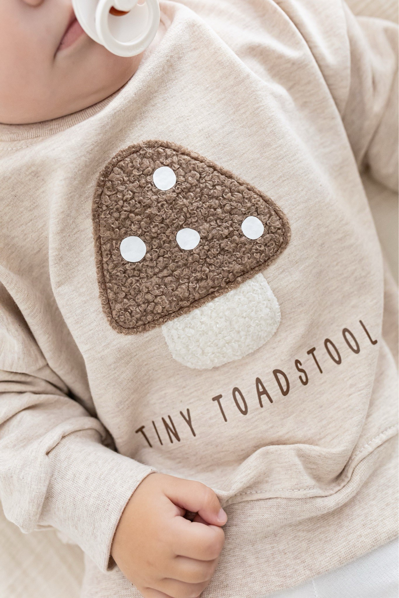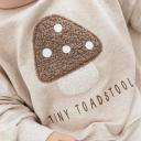 Ein zuckersüßer Oversize Sweater mit liebevollem Pilz-Print und Statement „Tiny Toadstool“. Perfekt für kleine Abenteurer, die es bequem und stylisch mögen.