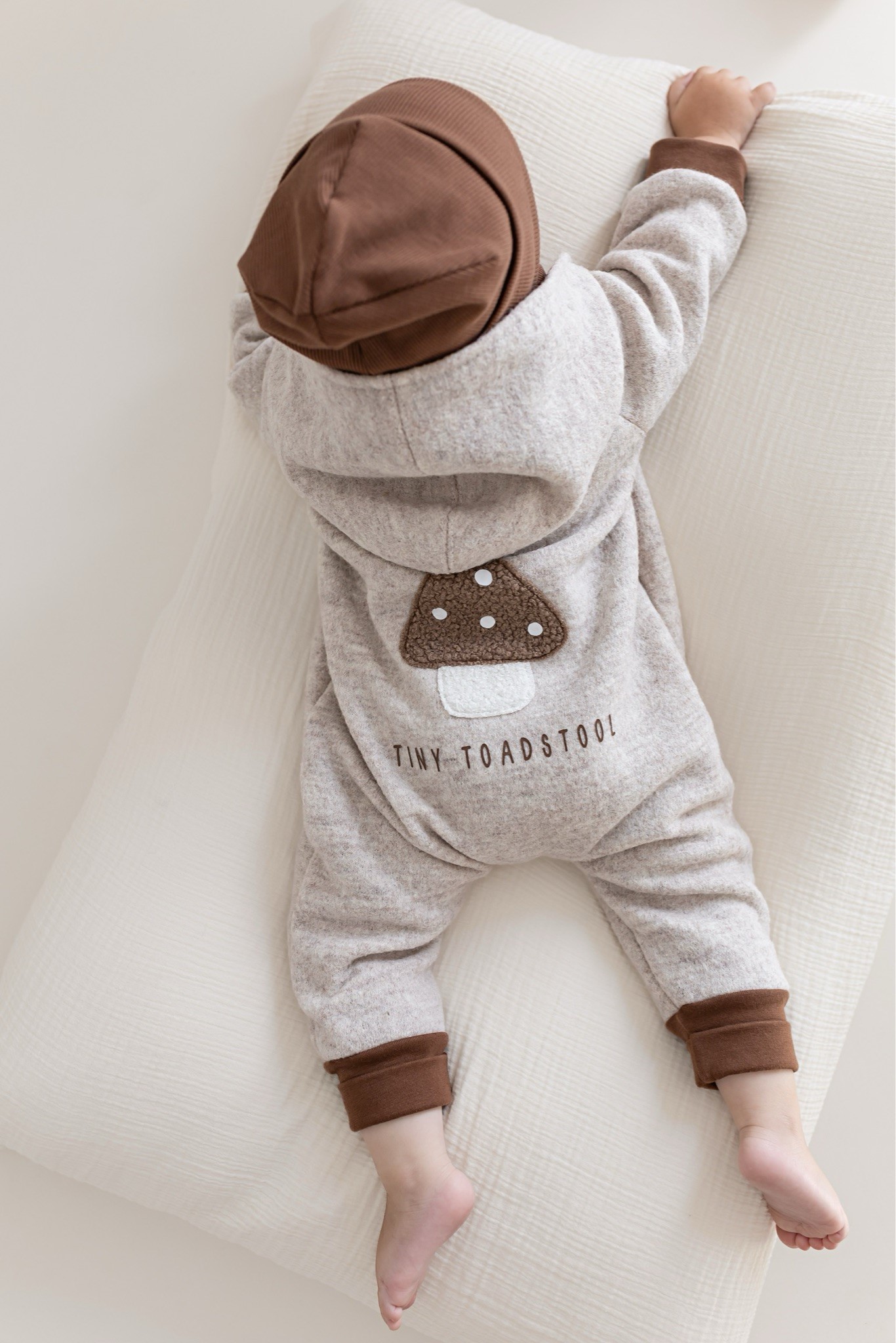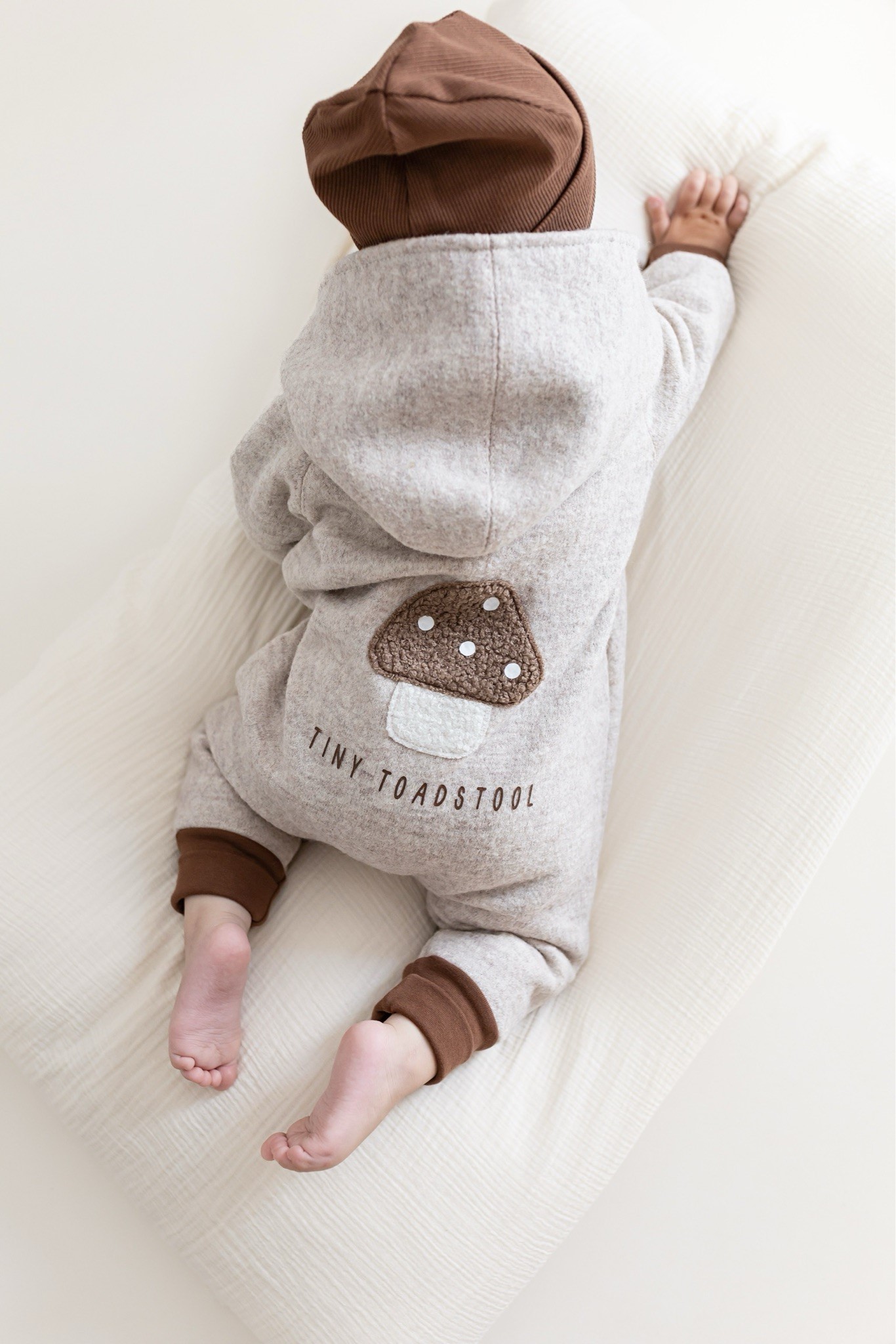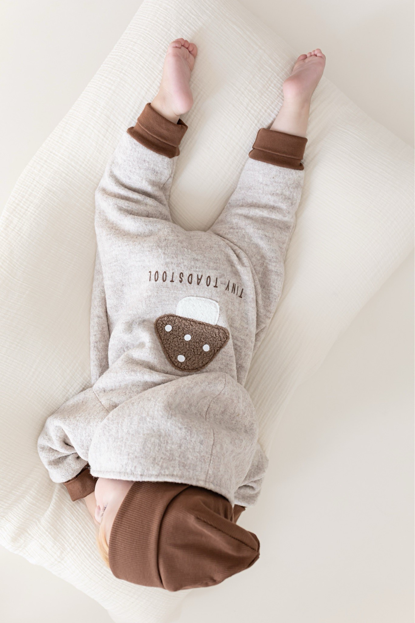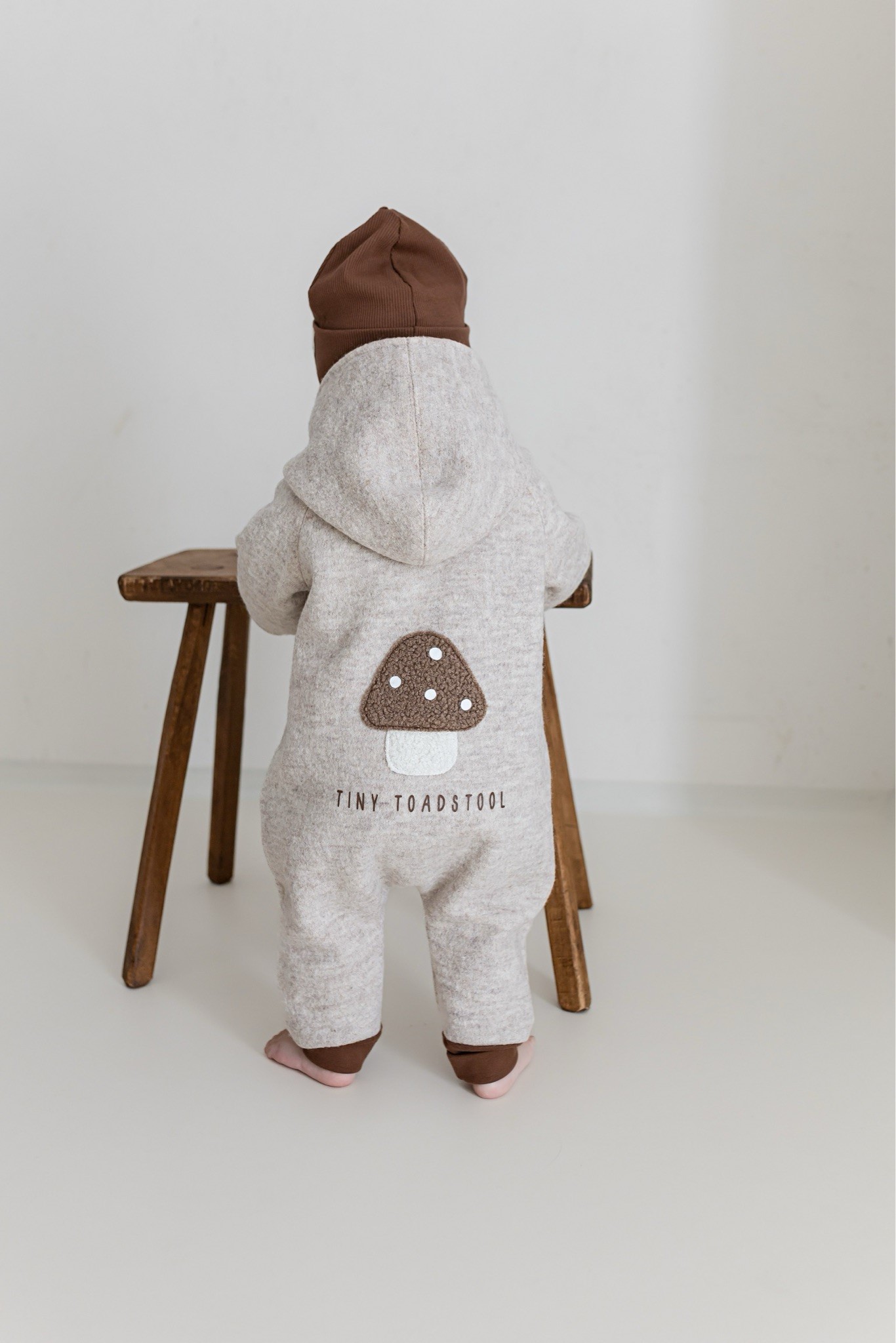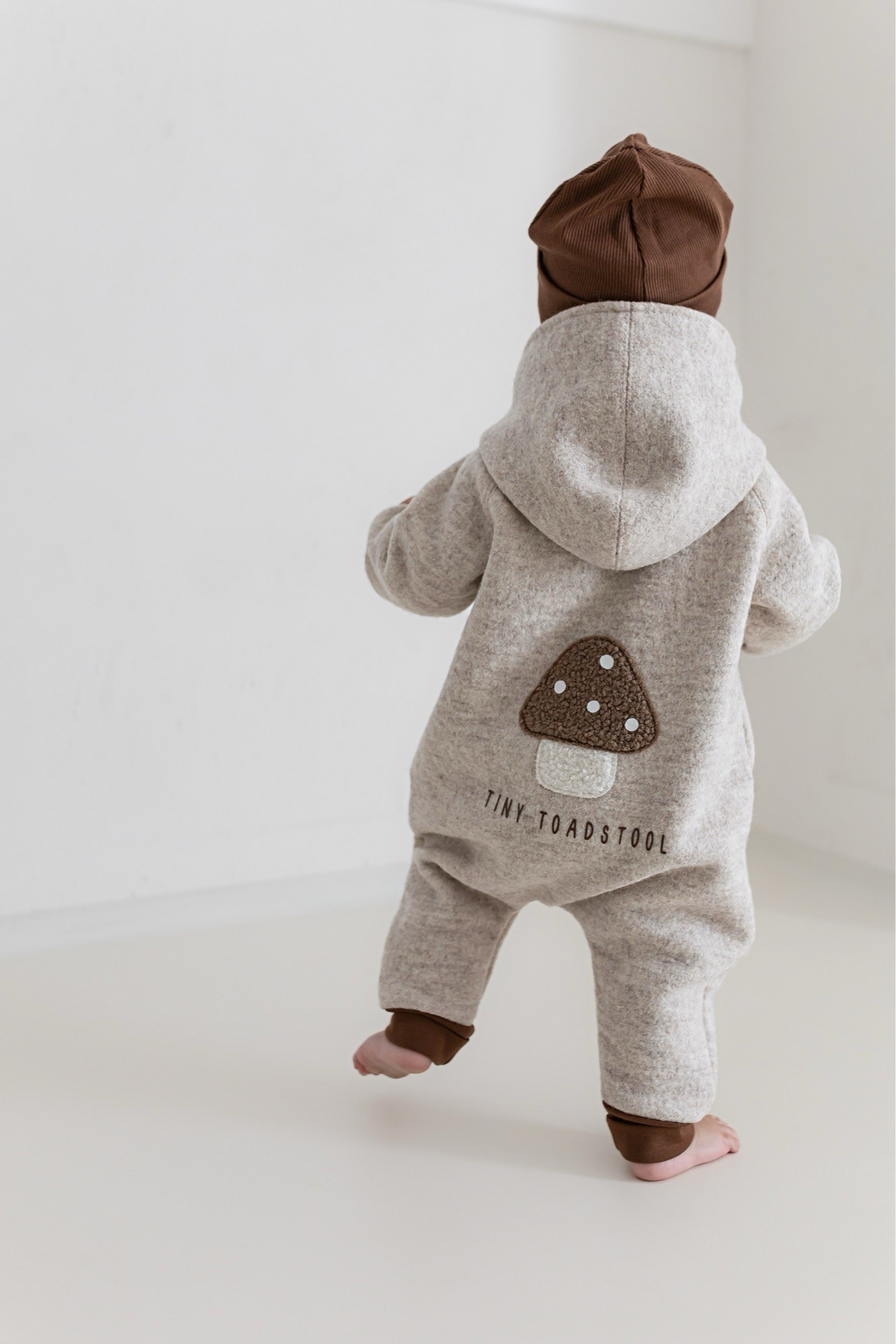 Unser Wollwalk Overall kombiniert natürliche Wärme, Bewegungsfreiheit und zeitloses Design. Das Highlight: das liebevoll aufgestickte Pilzmotiv mit Statement „Tiny Toadstool“ auf der Rückseite.